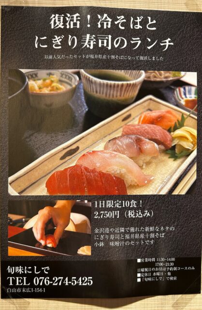 以前好評だった冷そばとにぎり寿司のランチを本日より1日限定10食でご用意いたします